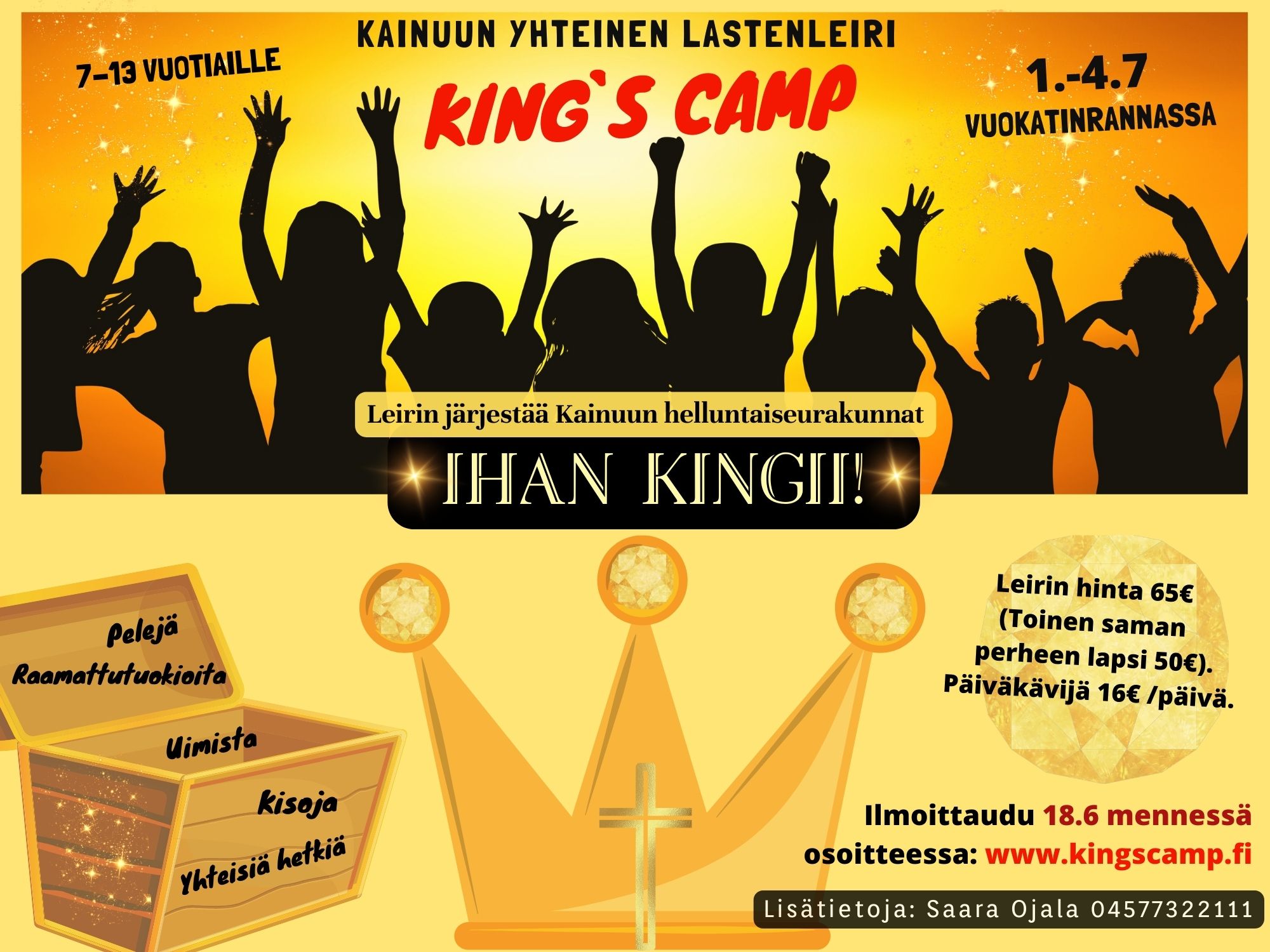 King’s Camp on lastenleiri 7-13-vuotiaille, joka järjestetään Sotkamossa Vuokatinrannassa (Vuokatinrannantie 8). Leirin ohjelmaan kuuluu hauskoja kesäaktiviteetteja, uimista, leiriolympialaiset, elokuvan katselua, hyvää ruokaa, raamattuhetkiä ja musiikkia – ja paljon uusia ystäviä!