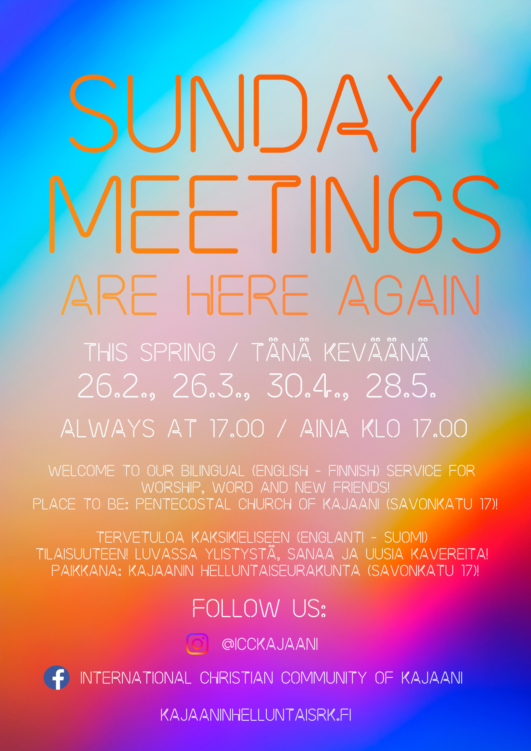 This spring we will continue with our bilingual services. Songs and speeches will be in English and Finnish. We hope that with these services we could serve the international people in Kainuu and also the next generation of Finns. In these services we get to hear the word of God, worship and pray together and hopefully make a lot of new friends. Feel free to invite your friends with you!